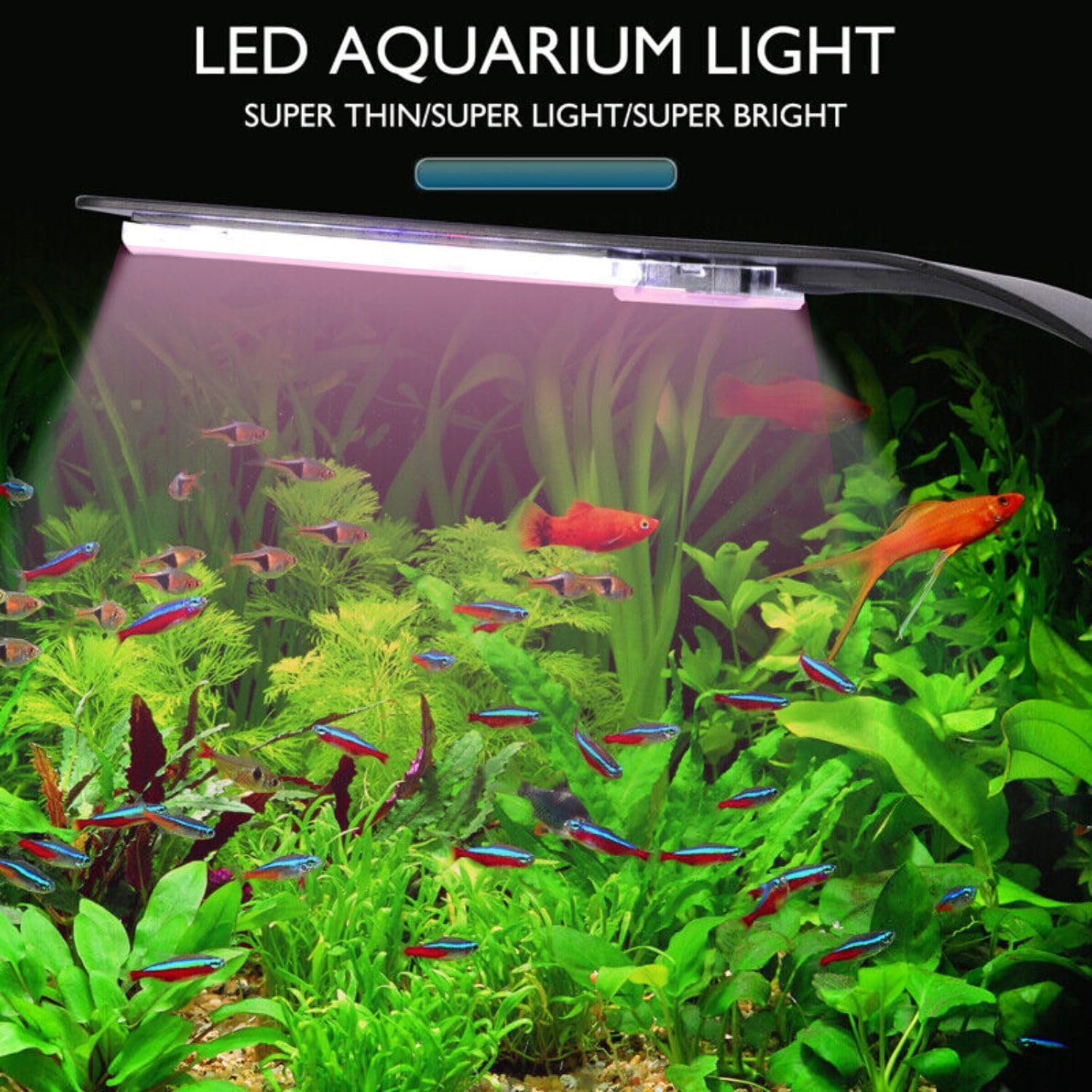 - [SUPER BRIGHT LED FISH TANK LIGHT] —Super bright, energy-efficient and long-lasting LED promotes healthy, vibrant growth of fish and aquatic plants, to produce brilliant lighting to your aquascape